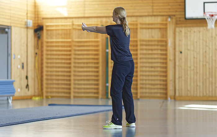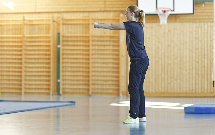 Vorbereitung: Füße schulterbreit auseinander. Arme nach vorne ausstrecken und eine aufrechte Haltung einnehmen.