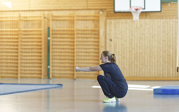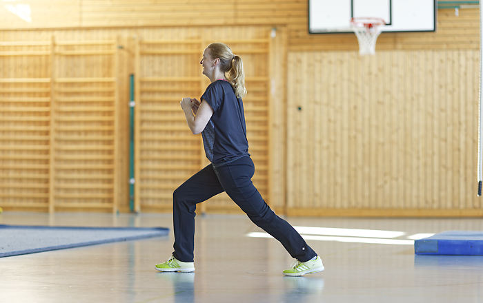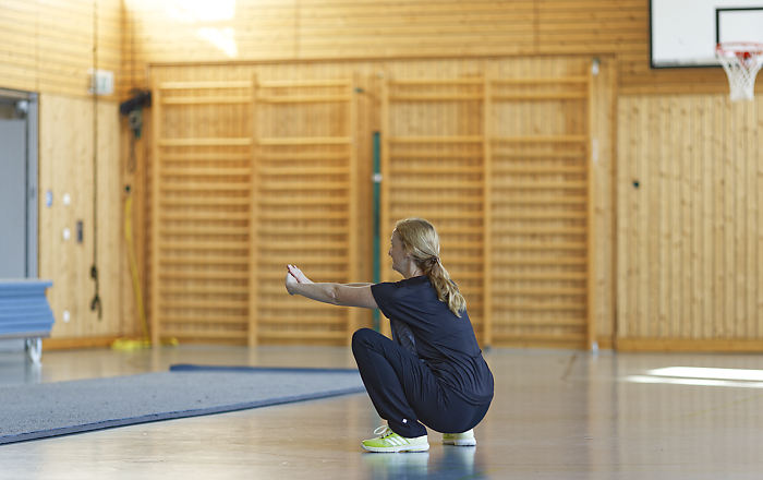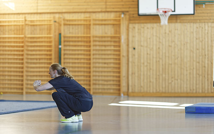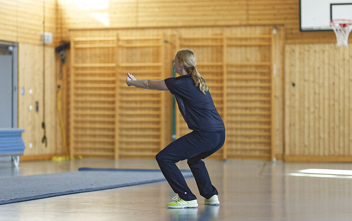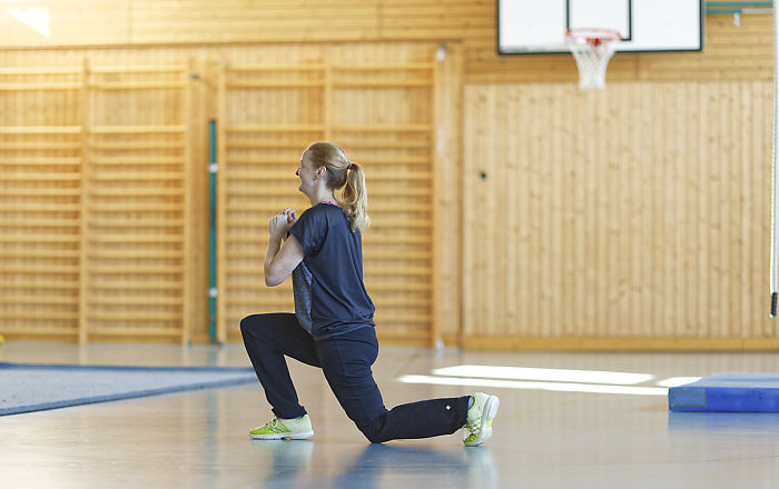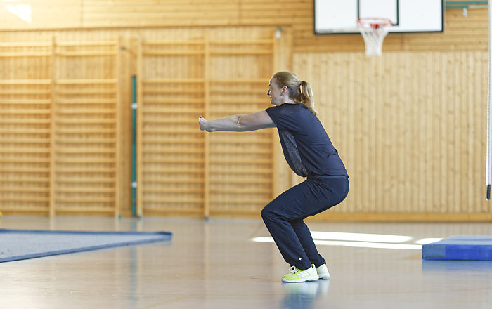 Kniebeuge: Hüfte nach hinten schieben und bei möglichst aufrechtem Oberkörper die Knie beugen, als ob man sich auf einen Stuhl setzen würde. Tief hinuntergehen, sodass die Oberschenkel mindestens parallel zum Boden sind, dann wieder hochkommen. Für mehr Details siehe auch die Beschreibung zur Basisübung "Kniebeugen (Squats)" weiter oben.