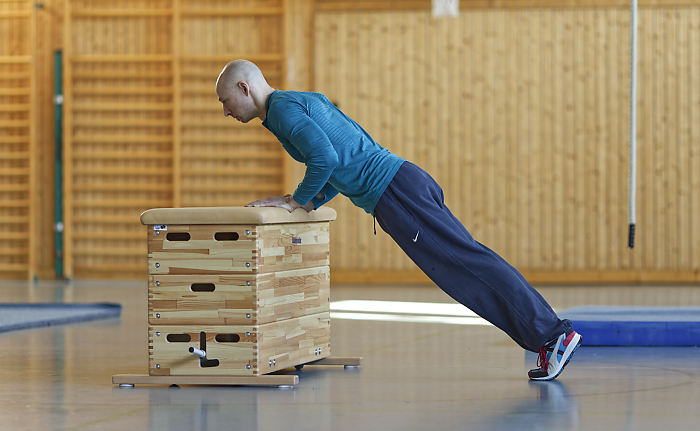 Ausführung: Aus der Stützposition den Oberkörper absenken, bis die Brust den Kasten leicht berührt, dann wieder hochdrücken.