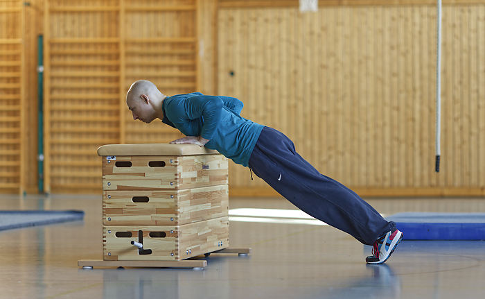 Vorbereitung: Stützposition mit durchgestreckten Armen und Körperspannung von den Füßen bis zu den Händen einnehmen. Die Hände ruhen dabei auf einer erhöhten Abstützmöglichkeit, wie z.B. einem Kasten. Je höher der Kasten, desto leichter fällt die Übung. Je niedriger der Kasten, desto schwerer fällt die Übung und desto höher der Trainingsreiz.