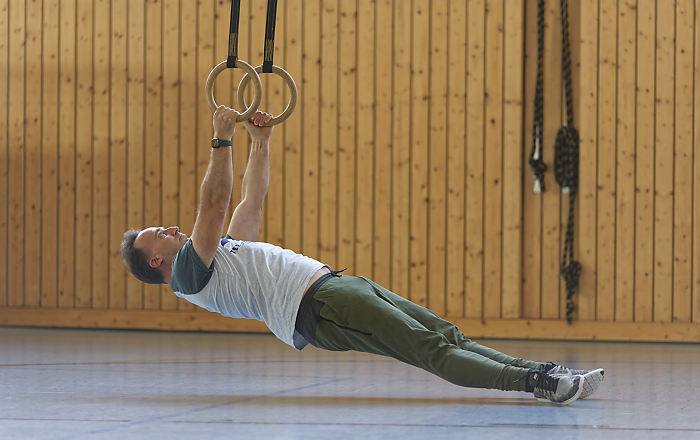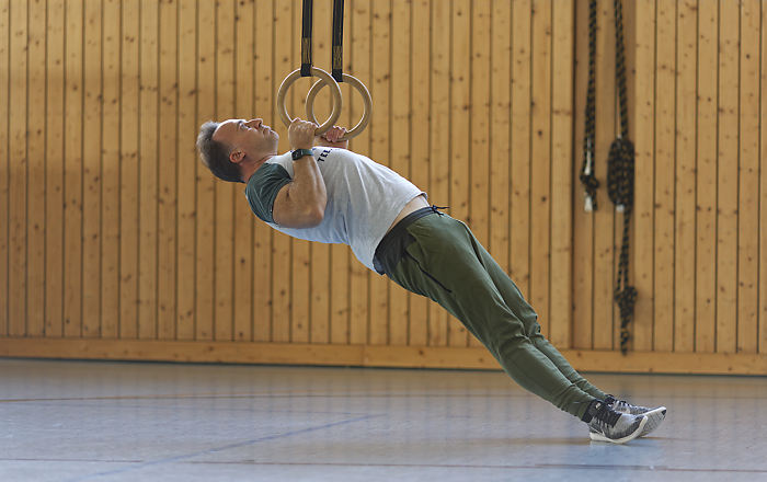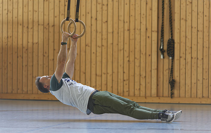 Vorbereitung: Mit gestreckten Armen an die Ringe hängen. Die Schultermuskulatur ist entspannt, sodass der obere Rücken etwas durchhängt. Die Intensität kann durch Verringerung der Schräglage verringert werden. Alternativ kann die Übung auch an einer Stange anstatt an Ringen ausgeführt werden.