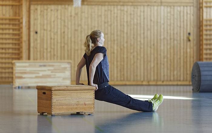 Vorbereitung: Auf den Rand einer Kiste oder Bank setzen. Die Händen neben dem Körper aufsetzen und mit dem Gesäß vom Rand rutschen, so dass die Arme das Körpergewicht halten.