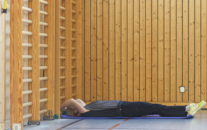 Vorbereitung: Vor einer Sprossenwand oder ähnlich stabilem Gerät flach auf den Rücken legen. Mit beiden Händen einen stabilen Griff an der Sprossenwand finden.