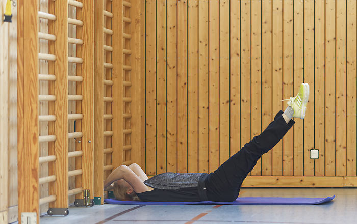 Ausführung: Beine gestreckt oder angewinkelt anheben und dann wieder kontrolliert in die Ausgangsposition absenken. Auch in der Ausgangsposition sollte die Körperspannung aufrecht erhalten werden. Durch Variation des Winkels der Knie (von angewinkelt bis komplett gestreckt) kann die Übung vereinfacht bzw. erschwert werden. Ebenso kann durch kurzes Halten in der höchsten Position die Intensität der Übung erhöht werden.