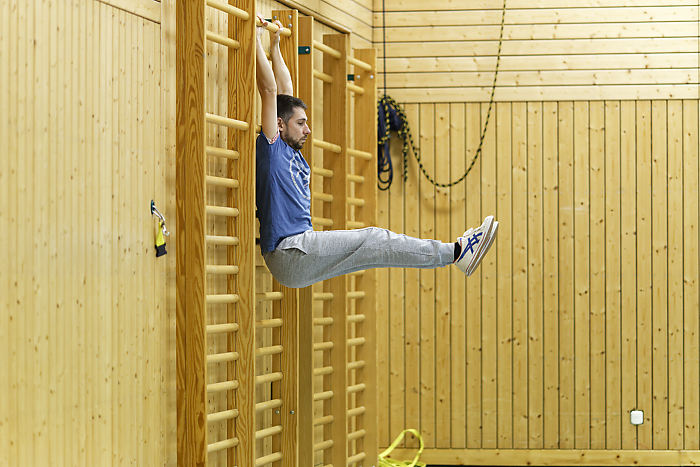 Vorbereitung: Mit den Händen an eine Sprossenwand oder ein Reck hängen. Die Beine leicht zusammen pressen und Körperspannung aufbauen, sodass die Beine nicht nach unten hängen sondern leicht nach vorne zeigen.