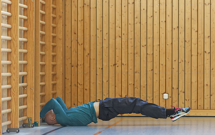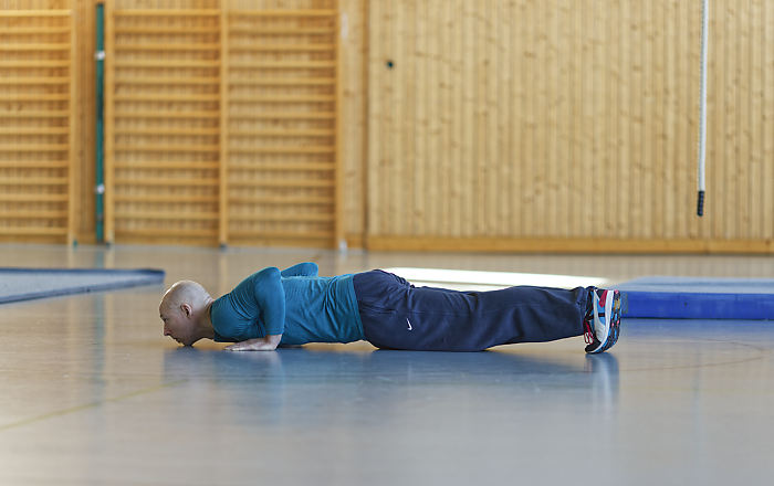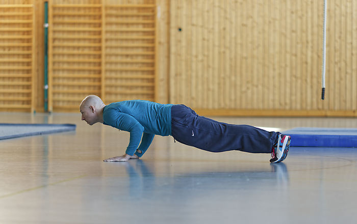 Ausführung: Arme kontrolliert beugen und damit Oberkörper absenken. Je nach Fortschritt kann der Kopf den Boden dabei leicht berühren oder schon vorher die Abwärtsbewegung gestoppt werden. Danach wieder in die gestreckte Position drücken.