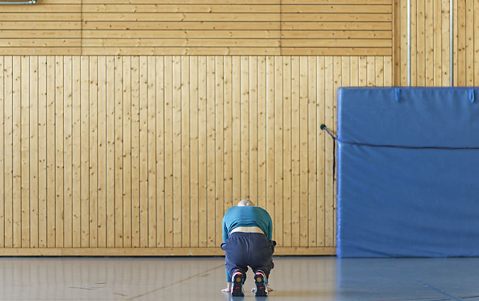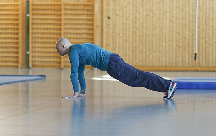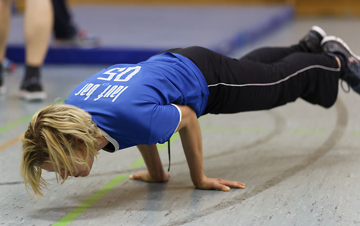 Vorbereitung: Stützposition mit durchgestreckten Armen und Körperspannung von den Füßen bis zu den Händen einnehmen. Die Hände ruhen dabei flach auf dem Boden. Die Übung kann deutlich erleichtert werden, indem die Knie auf dem Boden ruhen.