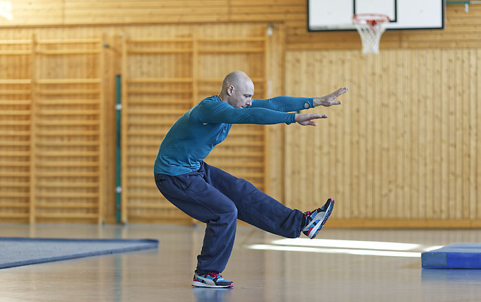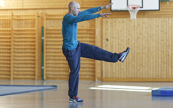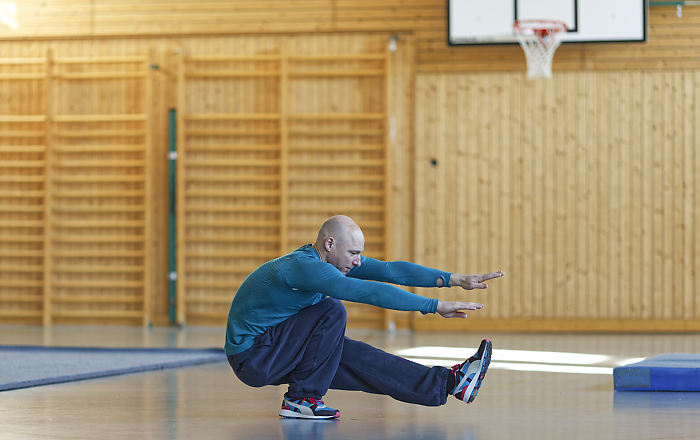 Ausführung: Kontrolliert das Standbein beugen und damit den Körper absenken als würde man sich auf einen Stuhl setzen wollen. Dabei Arme und Oberkörper als Gegengewicht so weit wie möglich nach vorne schieben. Die Abwärtsbewegung endet sobald der Oberkörper den Oberschenkel des Standbeins berührt. Dann wieder kontrolliert nach oben drücken. Der Fuß des Standbeins sollte dabei stets vollflächig Kontakt mit dem Boden haben.