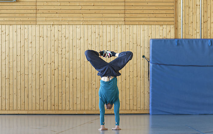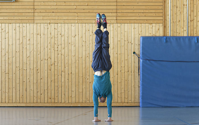 Vorbereitung: In die Hocke gehen und Hände schulterbreit auf dem Boden platzieren. Oberkörper mit den Beinen über die Hände schieben. Mit Kraft oder Schwung nun auch die Beine nach oben nehmen, sodass der Körperschwerpunkt über den Händen ruht.