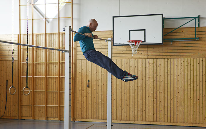 Vorbereitung: Klimmzugstange nicht komplett umgreifen, sondern die Handballen nahe am Handgelenk von oben auf die Stange setzen. Je nach Flexibilität der Handgelenke, die Stange soweit wie möglich mit den Fingern umgreifen oder eine lockere Faust bilden, die auf der Stange ruht. Dabei beachten, dass das Handgelenk sich über der Stange befindet.