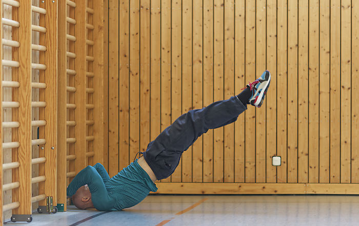 Vorbereitung: Vor einer Sprossenwand oder ähnlich stabilem Gerät flach auf den Rücken legen. Mit beiden Händen einen stabilen Griff an der Sprossenwand finden.