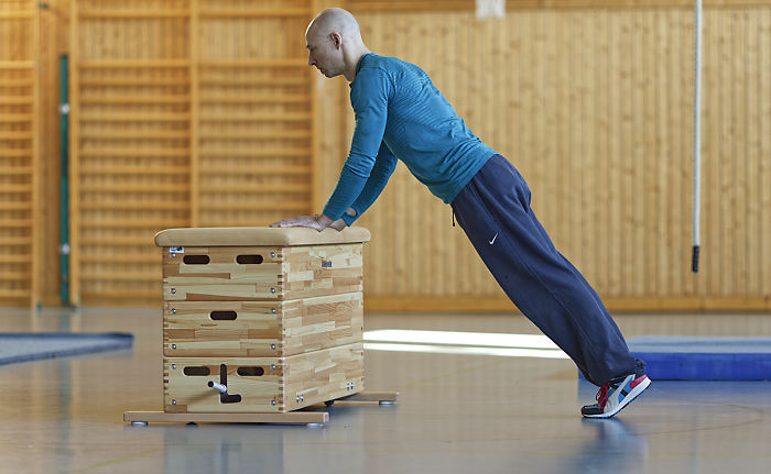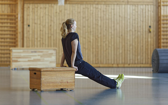 Ausführung: Aus der Stützposition den Oberkörper absenken, bis die Brust den Kasten leicht berührt, dann wieder hochdrücken.