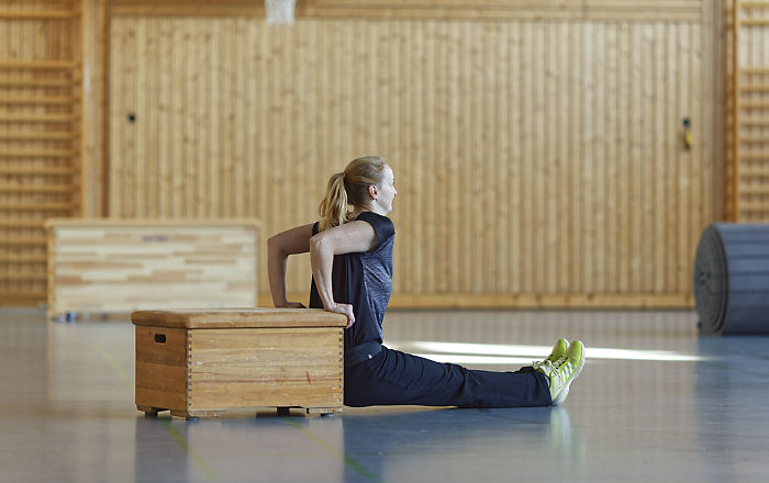 Vorbereitung: Auf den Rand einer Kiste oder Bank setzen. Die Händen neben dem Körper aufsetzen und mit dem Gesäß vom Rand rutschen, so dass die Arme das Körpergewicht halten.