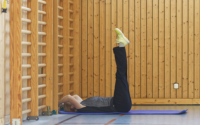 Vorbereitung: Vor einer Sprossenwand oder ähnlich stabilem Gerät flach auf den Rücken legen. Mit beiden Händen einen stabilen Griff an der Sprossenwand finden.