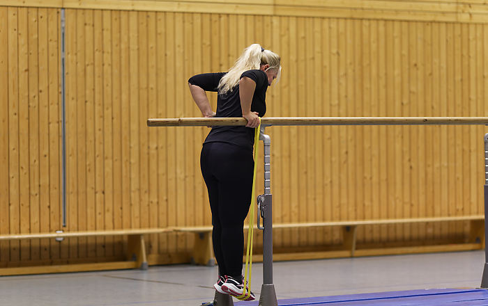 Vorbereitung: Einen Kasten vor dem Barren aufbauen, sodass man von dort aus bequem eine Stützposition mit ausgestreckten Armen einnehmen kann. Ein geeignetes Gummiband so an den Barrenholmen befestigen, dass man mit beiden Füßen oder Knien hineinsteigen kann. Abhängig von der Stärke des Gummibands nimmt dies einen Teil des Körpergewichts ab und erleichtert die Übung. Nun die oben beschriebene Stützposition einnehmen.