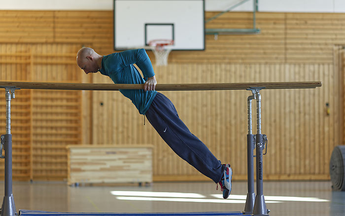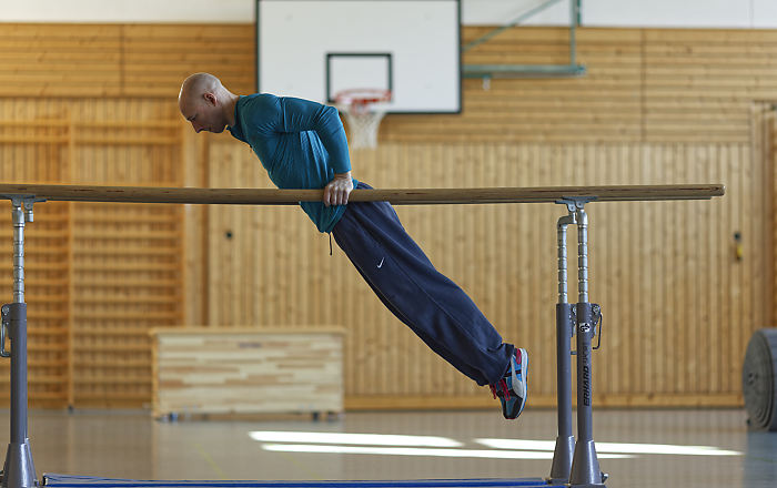 Vorbereitung: Barren auf eine Höhe bringen, bei der die Beine (angewinkelt oder gestreckt) in der tiefsten Position nicht den Boden berühren. Stützposition mit durchgestreckten Armen einnehmen. Mit der Neigung des Körpers können unterschiedliche Bereiche der Muskulatur angesprochen werden. Je stärker der Oberkörper nach vorne neigt, desto höher der Trainingsreiz für die Brust. Je aufrechter der Oberkörper, desto höher der Trainingsreiz für die Schultern.